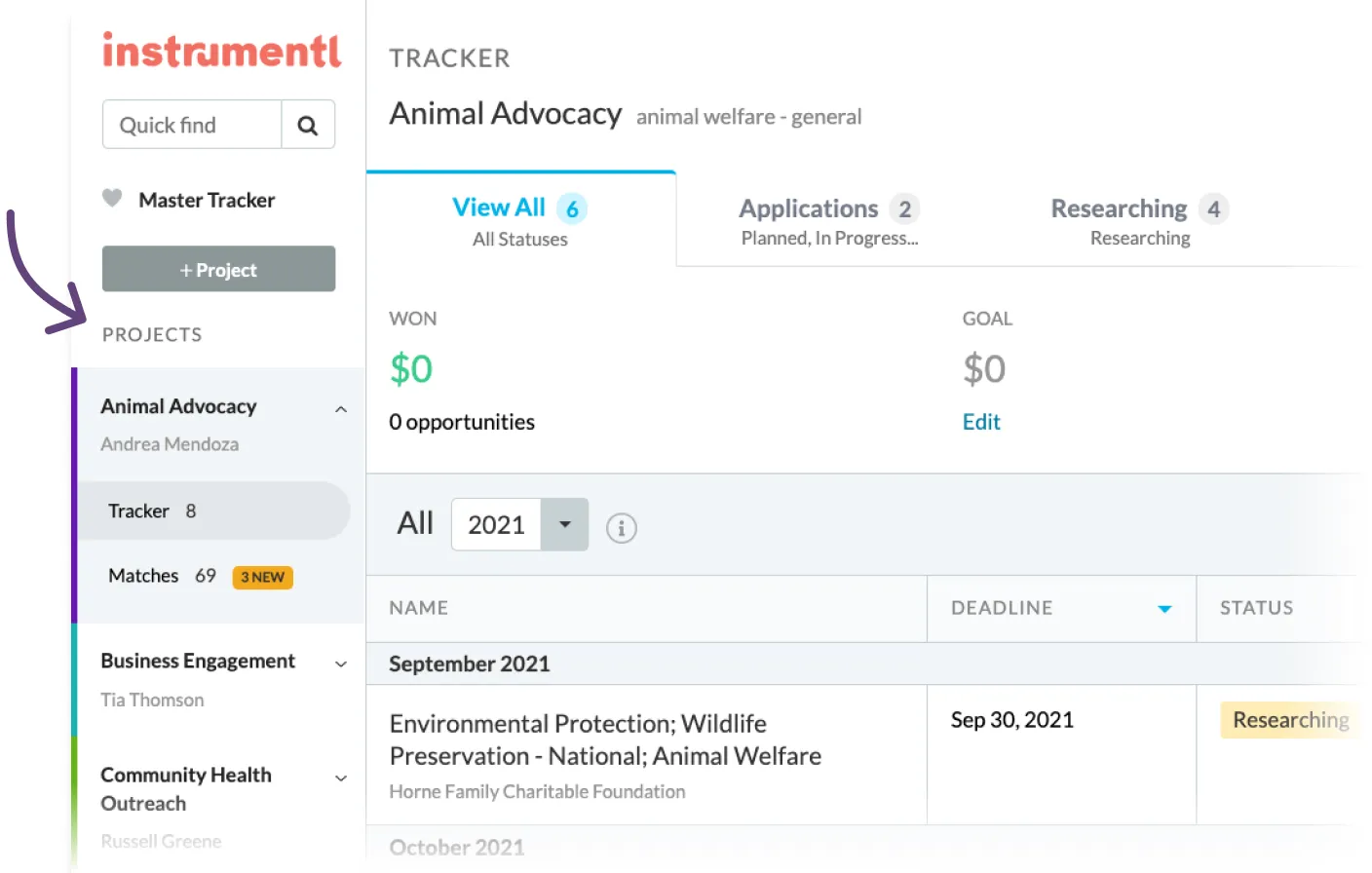 Create your project once and Instrumentl will continuously curate personalized funder recommendations based on your project. The result? 1.5x grant output and 3 hours/week saved in the first year of using Instrumentl.